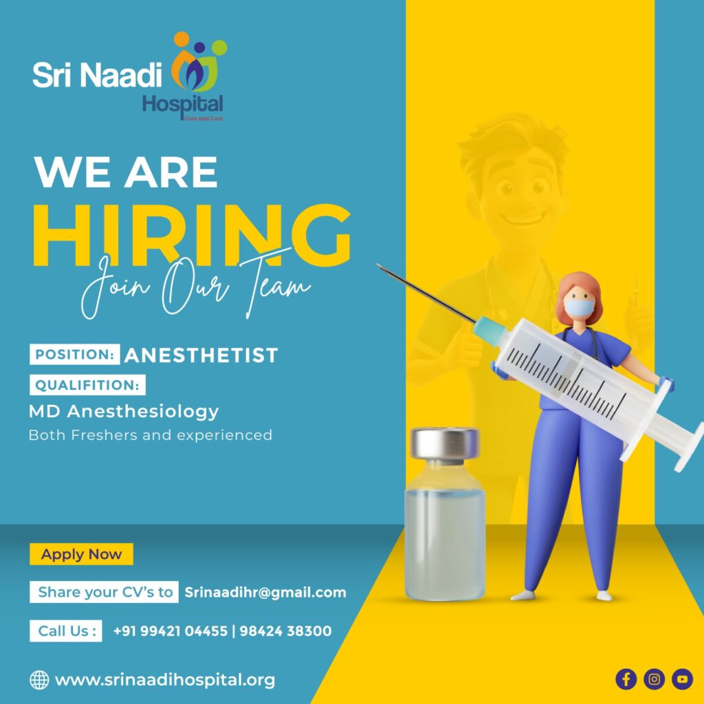 Job Title : Anesthetist Qualification Required : MD in Anesthesiology Experience : Fresher or Experienced Job Type : Full-Time Location : Sri Naadi Hospital – 121 & 122, Mayil Palayam Street, Naatyampaalpuram, Pattukkottai, Tamil Nadu 614602 Department : Anesthetist Key Responsibilities: Administer anesthesia to patients undergoing surgical, medical, or diagnostic procedures. Monitor patients’ vital signs and adjust anesthesia levels as needed. Collaborate with surgeons, physicians, and healthcare teams to ensure patient safety. Manage pre-operative and post-operative pain relief. Maintain accurate medical records and adhere to hospital protocols. Why Join Us? Opportunity to work in a reputed healthcare institution. Supportive and professional work environment. Competitive salary and growth opportunities. How to Apply Interested candidates may send their resume and credentials to Srinaadihr@gmail.com or Contact us on +91 99421 04455 | 98424 38300